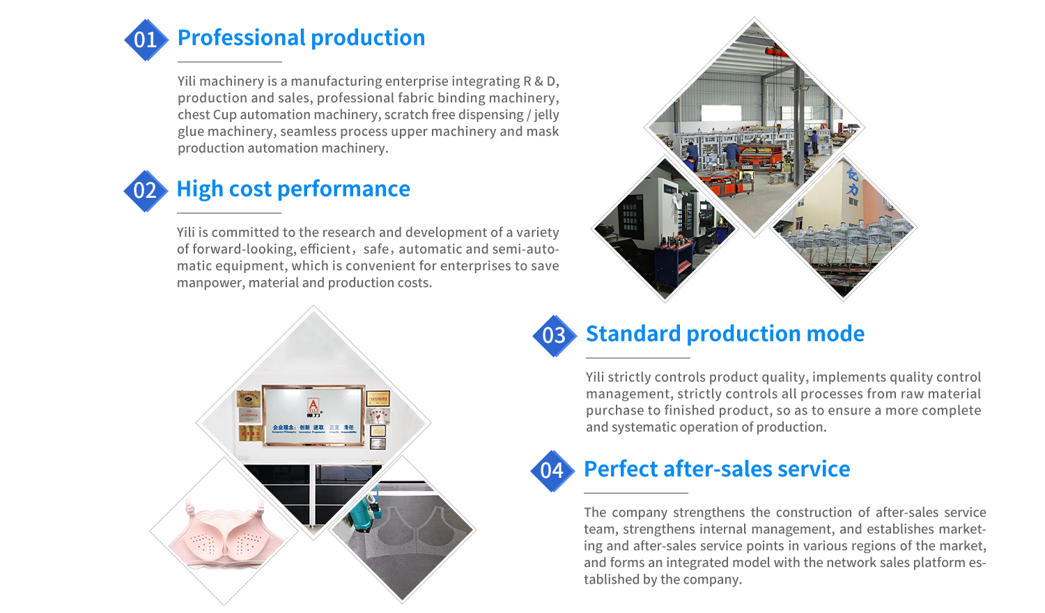 • Yili machinery is an enterprises which combines R&D,producing fabric laminating machinery, bra cups molding machinery, and seamless shoe-processing machinery.